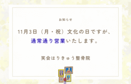 11月3日(月・祝)文化の日ですが、通常通り営業いたします!