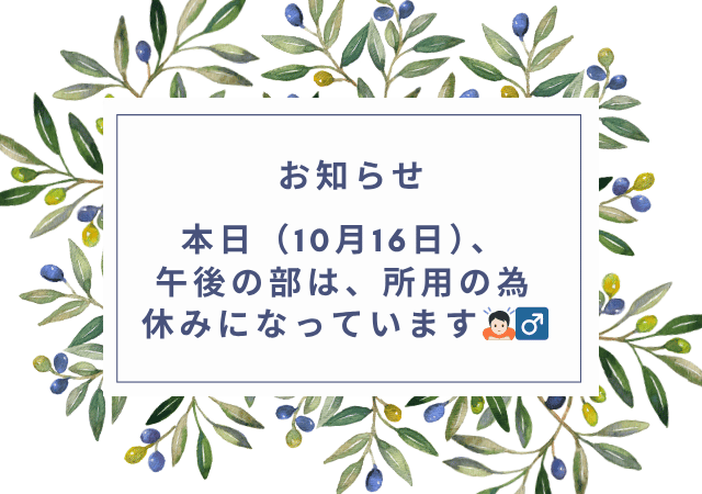 いつもありがとうございます^_^ 本日(10月16日)、午後の部は、所用の為休みになっています🙇🏻♂️ ご不便をおかけしますが、何卒宜しくお願いします🙇🏻♂️