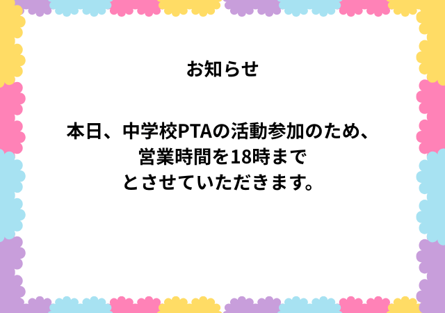 本日、中学校PTAの活動参加のため、営業時間を18時までとさせていただきます。
